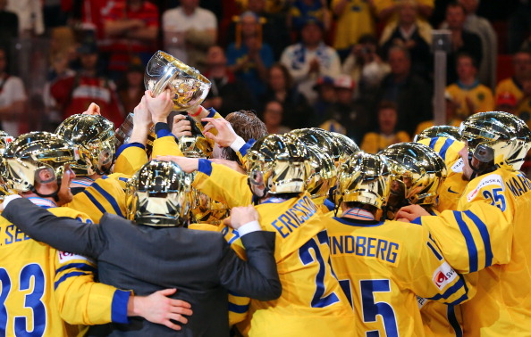 Jo Sveitsi-pelin ollessa kesken moni pelaaja puki päälleensä vaihtoaitiossa kultaiset kypärät, joka on ruotsalainen perinteinen tapa jääkiekon puolella mestaruutta juhliessa.