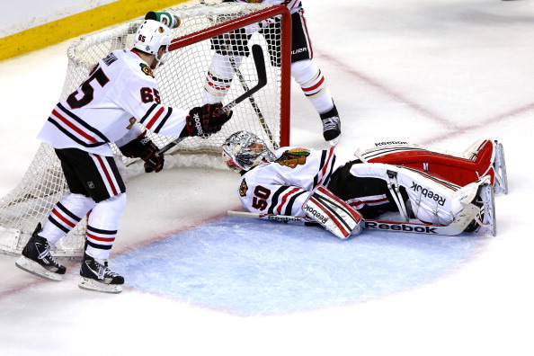 että Corey Crawford pitivät huolen siitä, ettei avauserässä maaleja nähty.