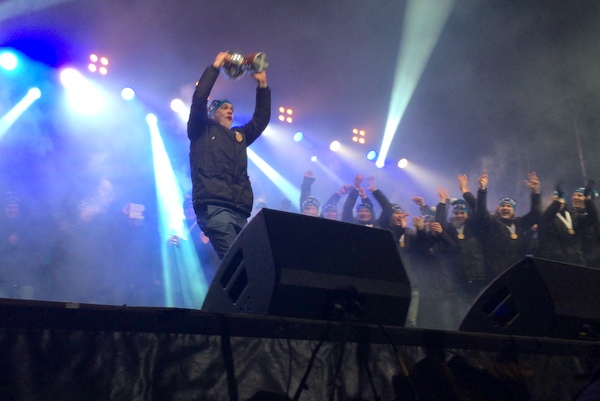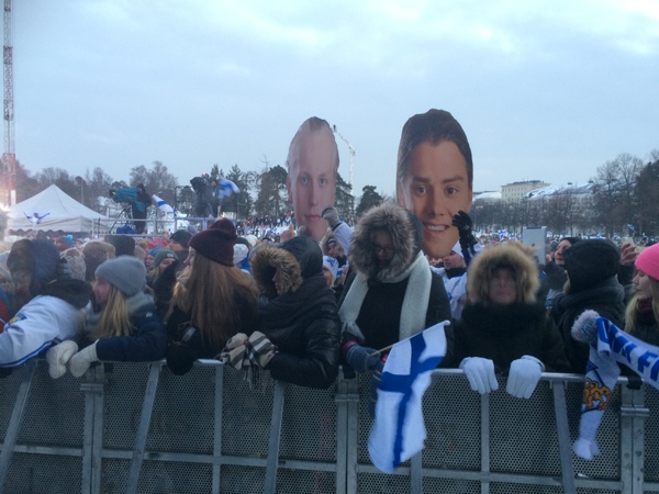 HELSINKI. Nuoret Leijonat juhlivat keskiviikkona mestaruutta paukkupakkasessa kansan edessä, kun Helsingin olympiastadionin viereen oli järjestetty juhlatilaisuus.