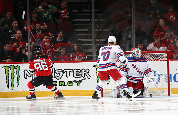 Hughes oli saalistanut ottelun pistesaldonsa jo ensimmäisen reilun kympin aikana. Maalissa ottavana osapuolena oli legendaarinen ruotsalaiskonkari Henrik Lundqvist tähän tapaan.