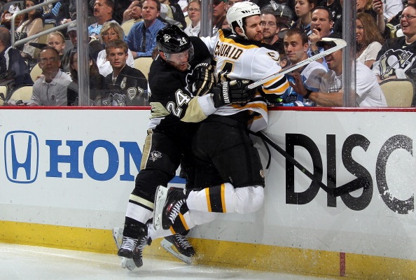 Pittsburgh Penguinsin hyökkääjä Matt Cooke taklasi selästä Boston Bruinsin puolustajaa Adam McQuaidia idän konferenssifinaaleiden avauksessa.