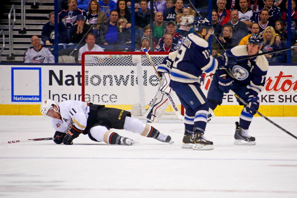 Anaheim Ducksin Saku Koivu joutui jättämään pelin kesken Columbus Blues Jacketsia vastaan.