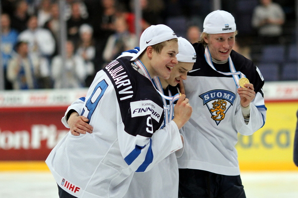 Nuorten Leijonien kultajoukkueen sankarit Jesse Puljujärvi, Patrik Laine ja Olli...