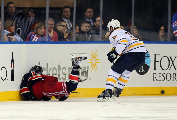 Enroth joutui jyrätyksi pelin toisessa erässä. Montrealin Brendan Gallagher yritti ajaa maalille, mutta Buffalo-pakki Jamie McBain oli toista mieltä....