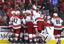 Carolina Hurricanes nappasi pudotuspelikevään ensimmäisen voittonsa. Joukkue löylytti hallitsevaa mestaria Washington Capitalsia murskalukemin 5-0.